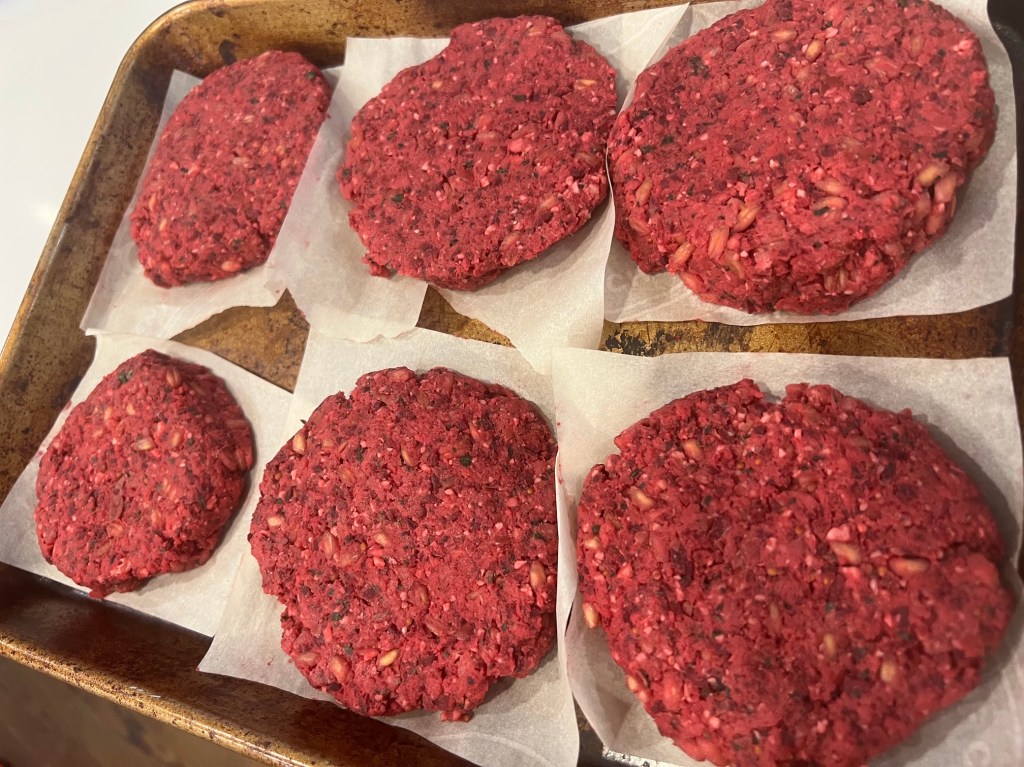 This weekend I got my copy of the Cook’s Illustrated Vegetables cookbook. It looks awesome and I am going to be trying many recipes from it. I started making the veggie burger, which has bulgur, pinto beans, beets, basil, mustard, and a bunch of other good stuff. I didn’t have bulgur so I substituted with farro which was quite good too.